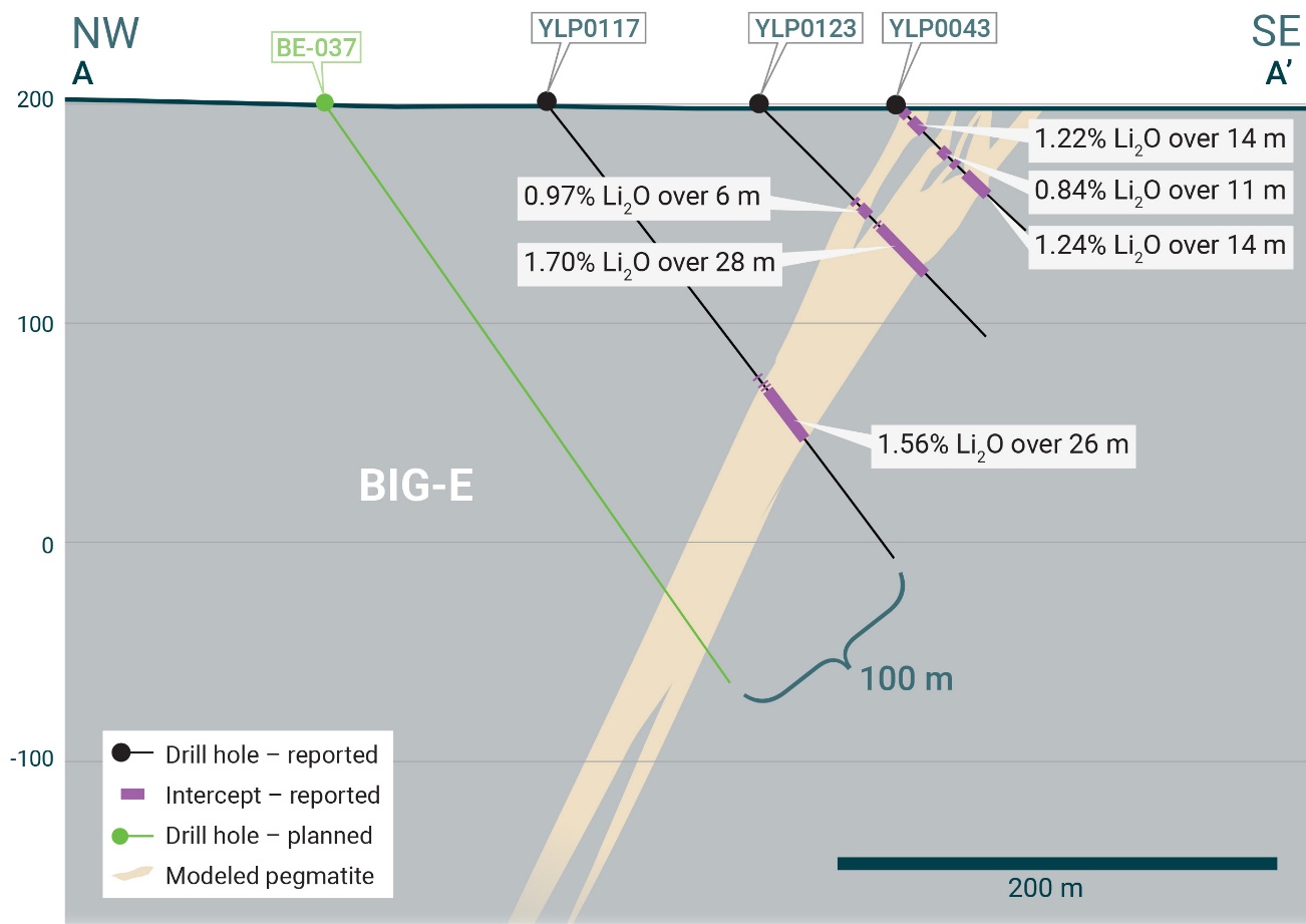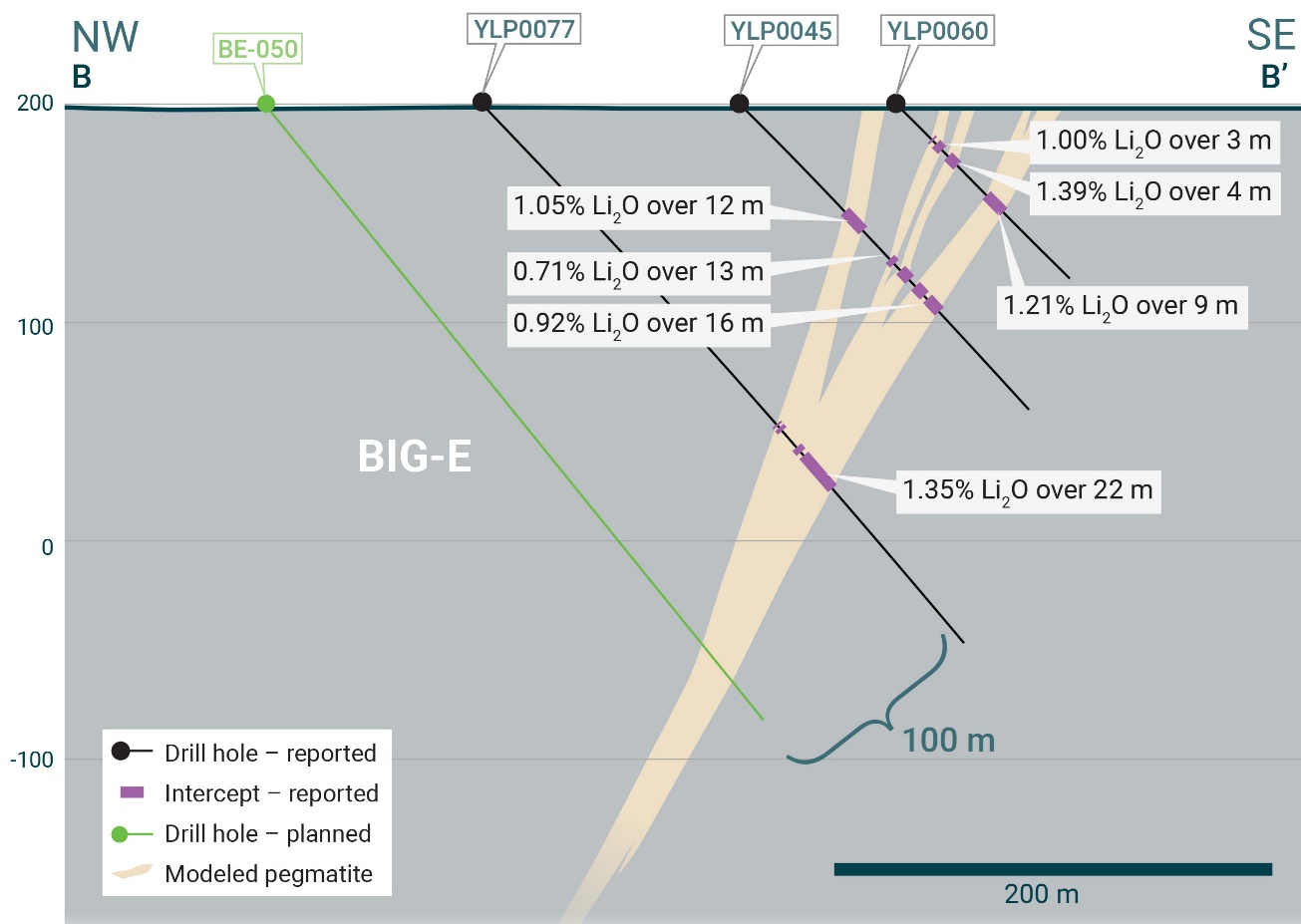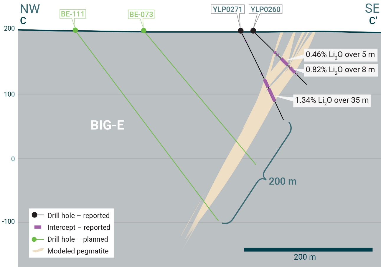 The BIG East pegmatite complex comprises a north-northeast trending corridor of parallel trending dykes that is exposed for at least 1,500m of strike length, with the northeast end displaced to the north ~350m (Figure 3 & 4). The width of the dike corridor ranges from 20-100 m and dips 55°-75° to the west. The 2023 and 2024 drilling tested 1200m of strike length, to a vertical depth between 150m and 250m from surface. The 2026 drill plan is composed of 26 resource holes (6,770m), with 24 of those holes (6,480m) planned for the main dike corridor and two holes (290m) planned at the Northeast extension (Figure 4). Drill holes are designed to extend spodumene intercepts that remain open at the limits of the 2023 and 2024 drilling to a vertical depth of ~300m (Table 1). Cross-section examples of the BIG East geometry and planned drill holes with 2023-24 results, are shown on section as Figures 5 to 7, and include 1.56% Li2O over 26m in YLP-0117 (Figure 5), 1.35% Li2O over 22m in YLP-0077 (Figure 6), and 1.34% Li2O over 35m in YLP-0271 (Figure 7). The two holes at the northern extension of the BIG East pegmatite dyke swarm step out from in YLP-0079 (1.29% Li2O over 15m) and YLP-0059 (1.04% Li2O over 12m).