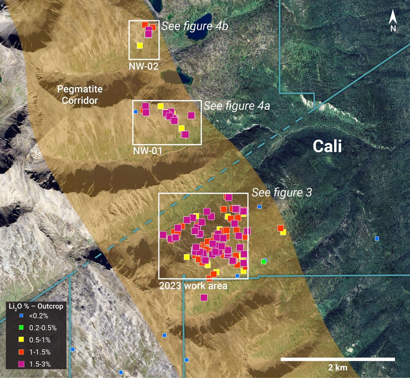 The Cali Project is located at the northwest extent of the Little Nahanni Pegmatite Group (LNPG), a district-scale zone of parallel-trending spodumene pegmatites dykes that form a corridor 13 km long, and hundreds of metres wide (Figure 2). The extensive rock exposures of dykes across LIFT’s property provide excellent conditions for evaluating the economic potential of the dyke corridor through systematic mapping, prospecting, and channel sampling programs. In 2023, LIFT completed geological mapping and sampling (158 rocks, Table 2) of pegmatite exposures in the southeastern part of the Cali property (the “2023 work area” in Figure 2), defining an area of strong spodumene mineralization approximately 1 km by 1.5 km.