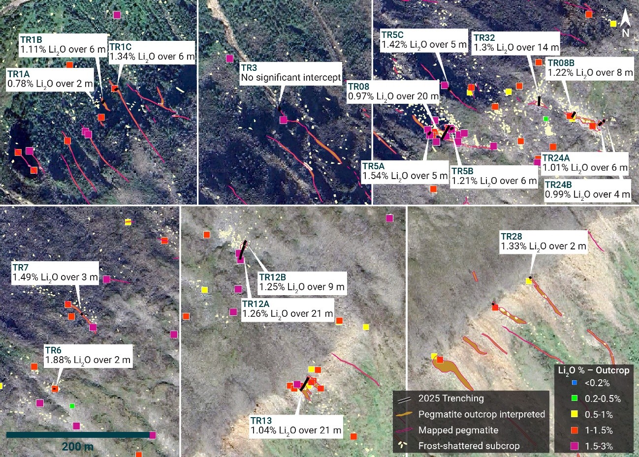 In the 2023 work area, 160 one-metre samples were collected from 19 channels ranging between 2 and 19 m in length. Individual channel samples were assayed for lithium and subsequently combined into composites, which are presented in Table 1 and shown in Figure 3. Select channel samples were also submitted for metallurgical recovery test work, with results expected in Q1 2026. Of the 19 channels, 17 returned at least two consecutive metres grading above 0.8% Li₂O, including a highlight of 1.9% Li₂O over 21 consecutive metres (Table 1; Figure 3). Geological mapping indicates the spodumene dykes in this area are typically 1–5 m wide and are intercalated with barren metasedimentary country rock.