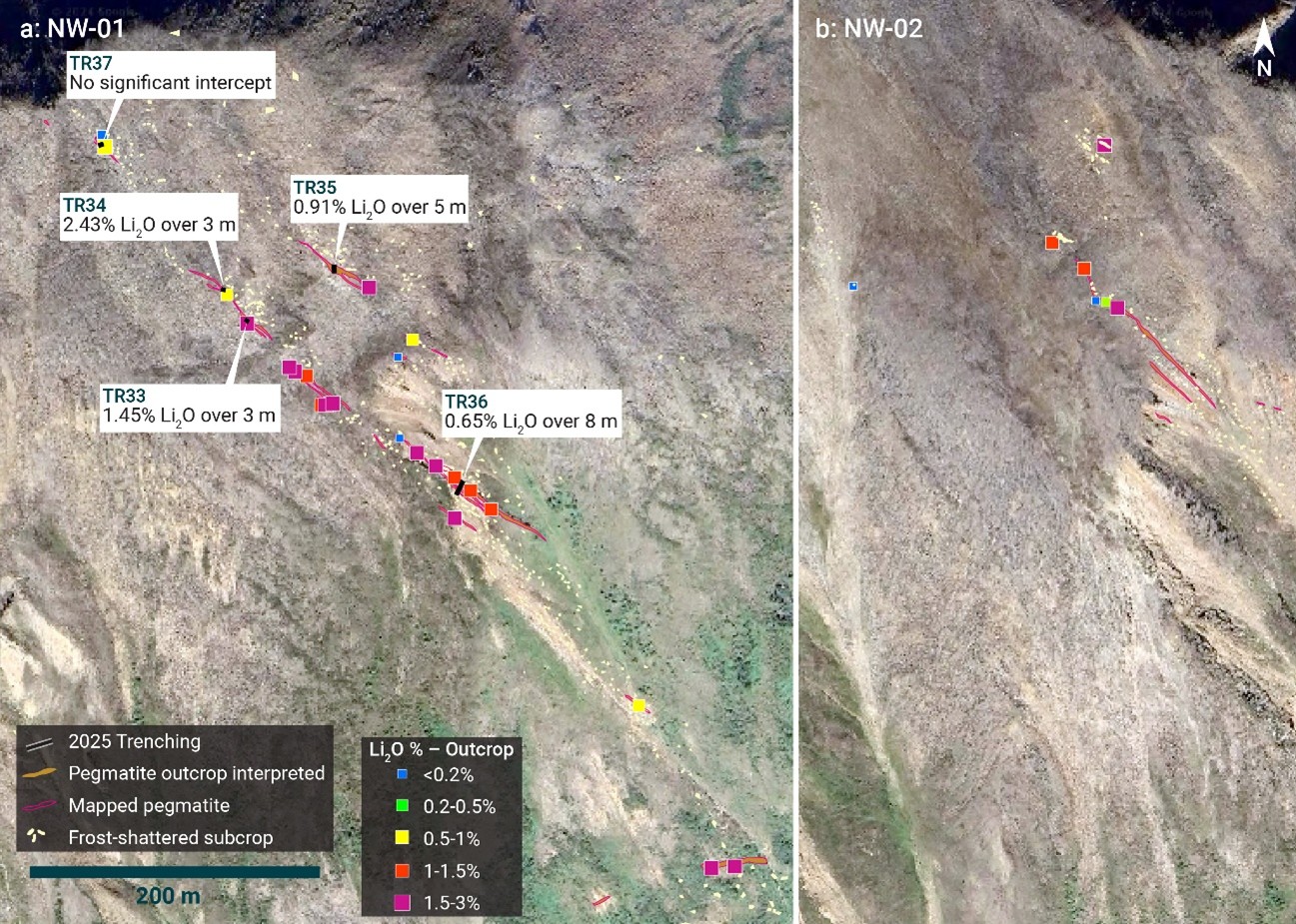 Figure 4a-b – Location of newly discovered pegmatite dykes in the (a) NW-01 and (b) NW-02 areas, as well as channel sampling results.