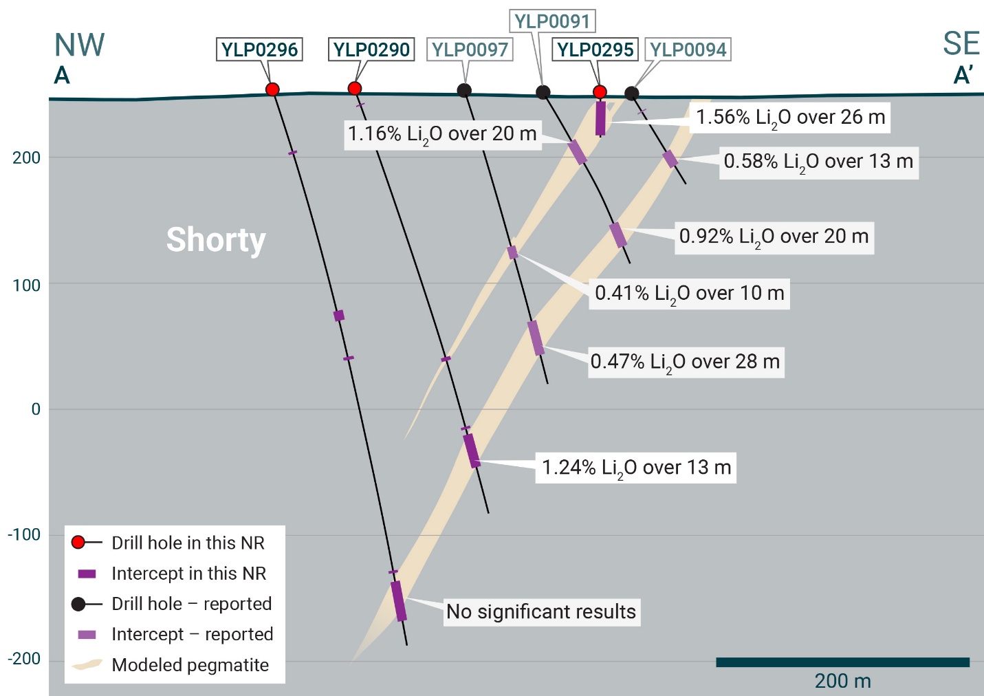 YLP-0301 was drilled on a section 100 m southwest of YLP-0290/0296 to test the Shorty corridor approximately 300 m below the surface and 100 m downdip of previously released YLP-0111 (0.52% Li₂O over 11 m from one dyke). Drilling intersected pegmatite at the expected depth but assay results were negligible.