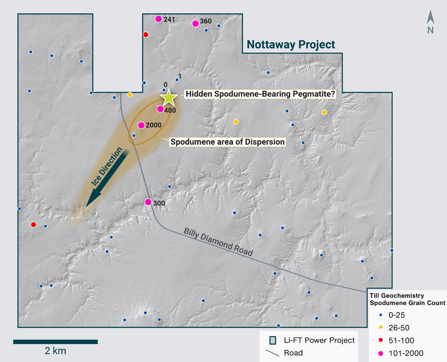 Target: Lithium-cesium-tantalum (LCT) spodumene-bearing pegmatite dykes interpreted to be the source of a 1 km x 3 km high-tenor spodumene grain anomaly in glacial till