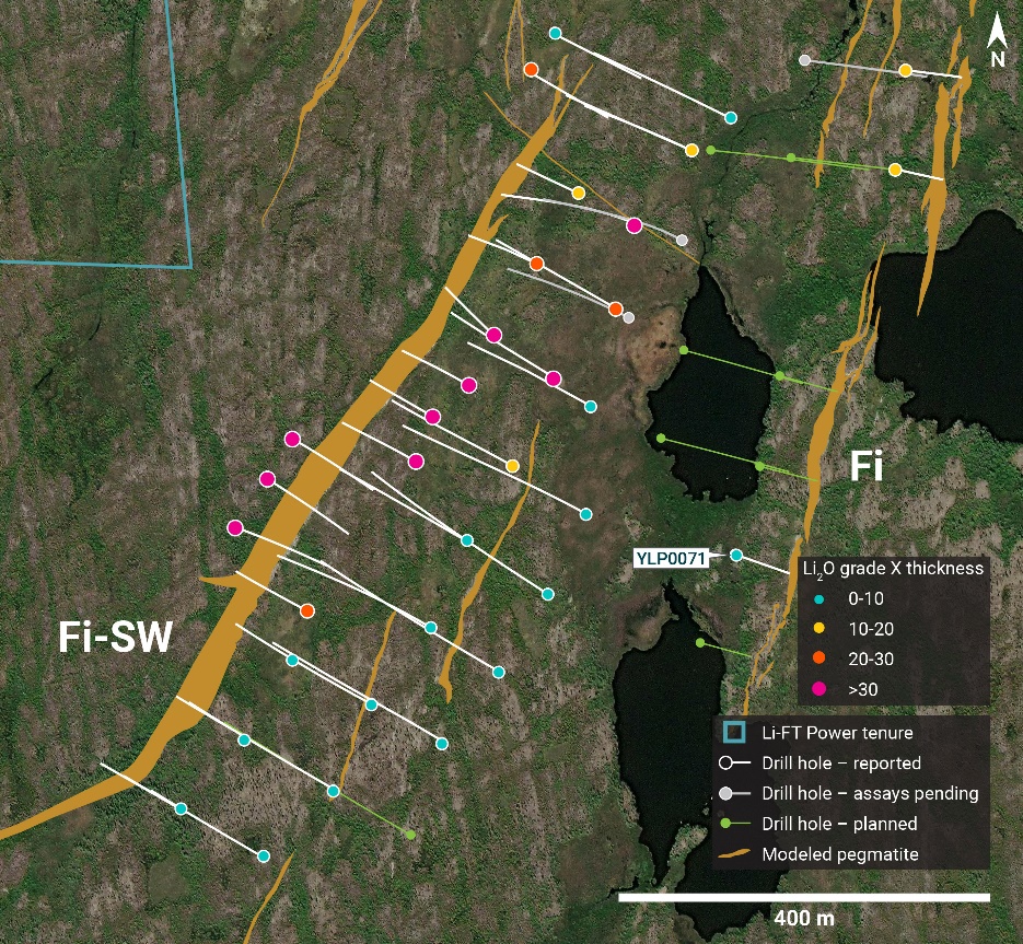 YLP-0071 tested the Fi Main pegmatite just 100 m from its southern mapped extent and 50 m vertically below the surface. Drilling intersected a single 17 m wide pegmatite dyke that returned negligible grade.